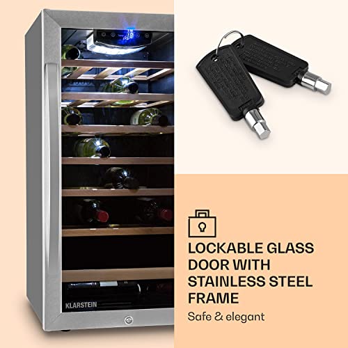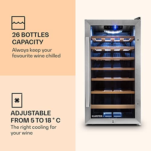 Klarstein Vivo Vino 26 – vrijstaande wijnkoeler met roestvrijstalen glazen deur, compacte wijnkoeler, 88 liter inhoud, 26 flessen, temperatuur: 5 tot 18 ° C, verlichting, zwartzilver