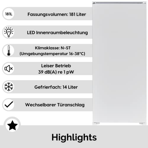Specificaties: WOLKENSTEIN Inbouwkoelkast WKS190.4 EB | Netto-inhoud 181 l l 4 **** Vriesvak l Hoogte 122 cm l Breedte 54 cm l Koelgedeelte 167 l l l vriesgedeelte 14 l l 39 dB l LED verlichting